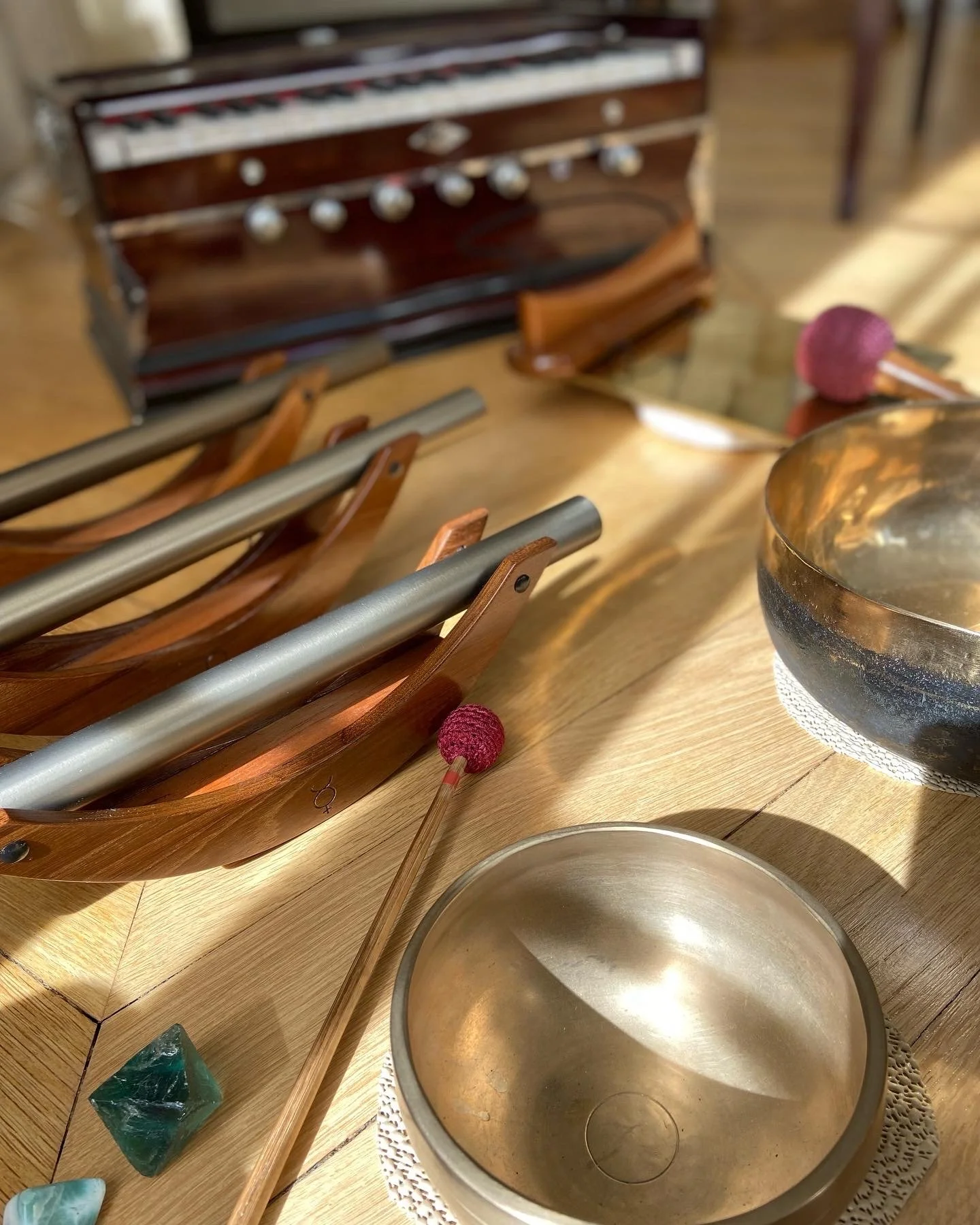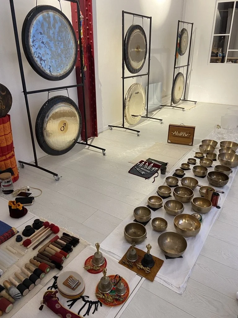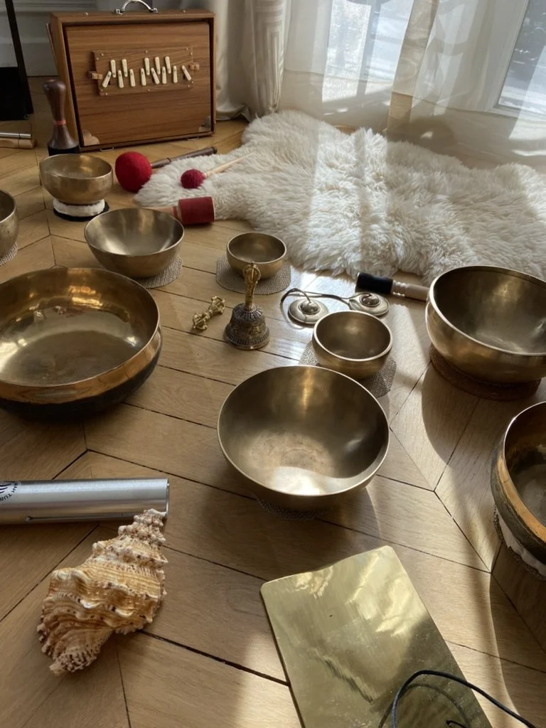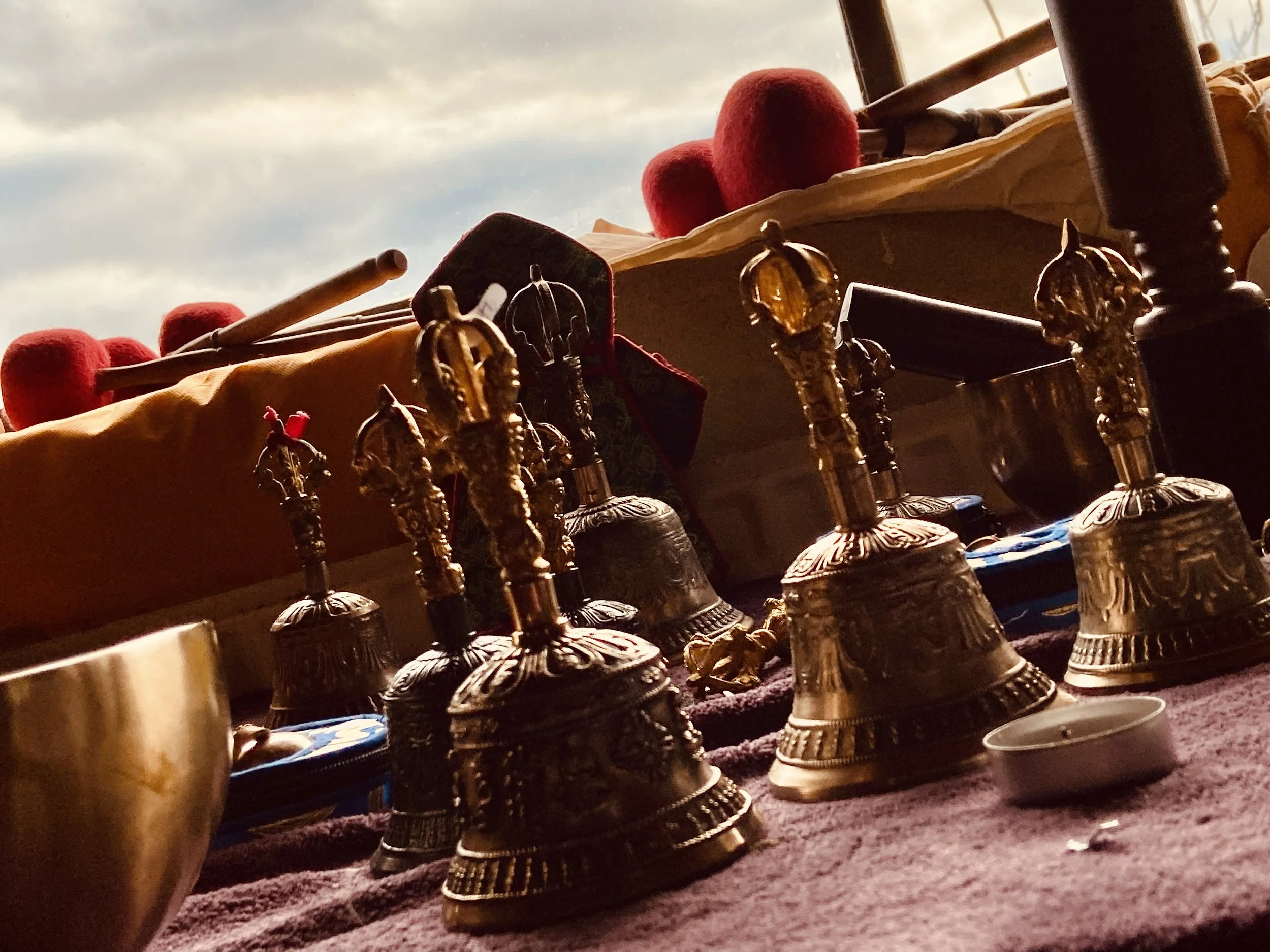 En fonction des besoins, il m’arrive d’utiliser d’autres instruments tels que sounds plates, sound boats, tingshas, dorje et ghanta.